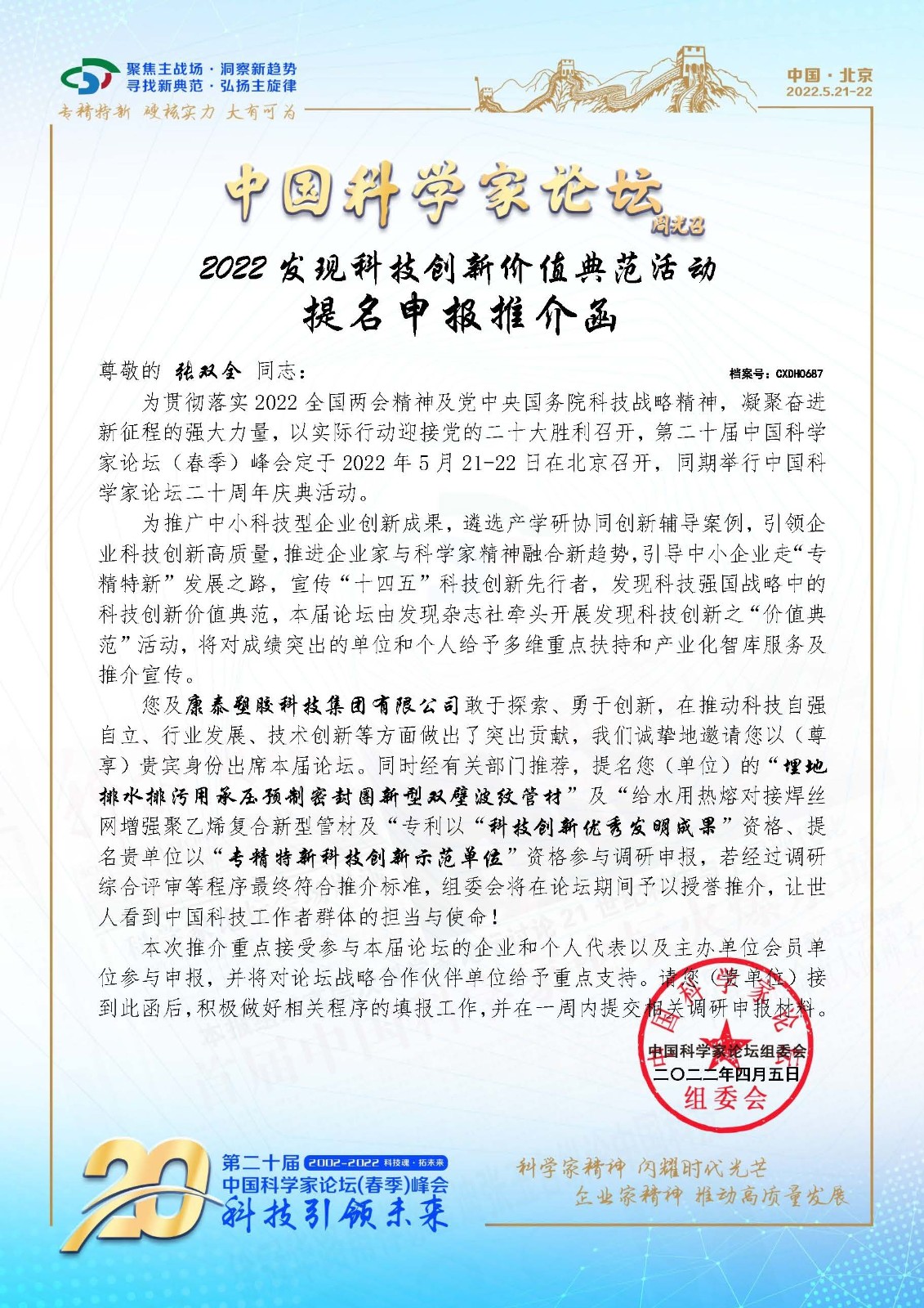 5月21日康泰集團(tuán)總工程師兼技術(shù)總監(jiān)張雙全應(yīng)邀參加了“第二十屆中國(guó)科學(xué)家論壇線上會(huì)議”。張總詳細(xì)介紹了企業(yè)的基本情況,重點(diǎn)介紹了集團(tuán)差異化產(chǎn)品。通過(guò)線上會(huì)議有效宣傳、推介了康泰集團(tuán)差異化產(chǎn)品,傳播了康泰品牌。