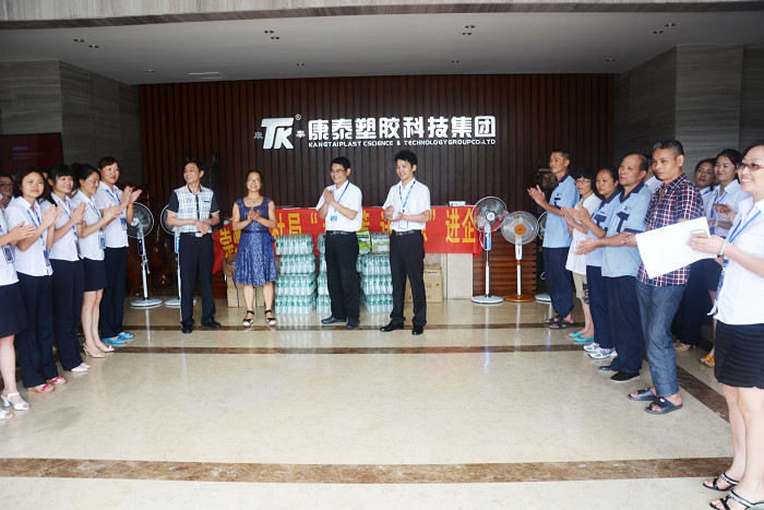 ?????? 8月7日下午,崇州市人力資源和社會保障局副局長、工會主席李茂清帶領(lǐng)局“送清涼”慰問組,來到康泰塑膠科技集團(tuán)有限公司,工會主席吳彬及人事行政中心呂旭梅經(jīng)理接待了慰問組。人社部門為公司職工送上了電風(fēng)扇、礦泉水、和防暑物品,并將有關(guān)勞動安全、工資待遇等內(nèi)容的人社政策宣傳資料送到職工手中,使職工進(jìn)一步了解有關(guān)政策法規(guī),依法主動保護(hù)自身合法權(quán)益。