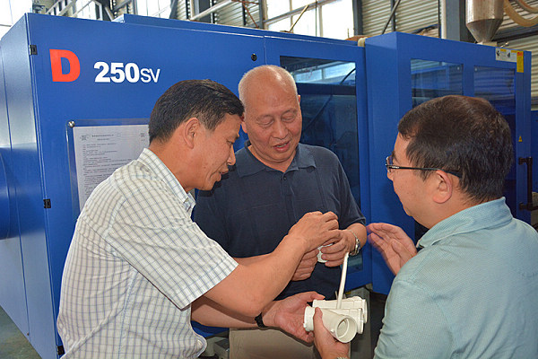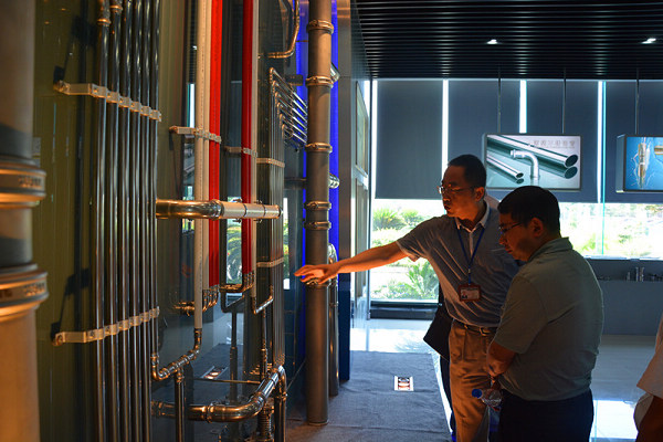 ??? 6日下午2點(diǎn),考察團(tuán)一行抵達(dá)集團(tuán)公司,在林總裁的帶領(lǐng)下,考察團(tuán)首先參觀了公司生產(chǎn)車間,其中重點(diǎn)參觀考察 了成品庫房、管件車間、自動(dòng)卸料系統(tǒng)、模具事業(yè)部、燃?xì)馍a(chǎn)線、技術(shù)研發(fā)中心、不銹鋼公司給水部及展廳、集團(tuán)公司展廳。