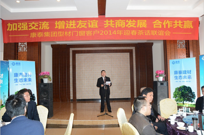??? 當(dāng)日,以“加強(qiáng)交流、增進(jìn)友誼、共商發(fā)展、合作共贏”康泰集團(tuán)型材門(mén)窗客戶(hù)2014年迎春茶話(huà)聯(lián)誼會(huì)在美麗的街子古鎮(zhèn)味江味花園飯店隆重召開(kāi),一百多名客戶(hù)參加了此次聯(lián)誼會(huì),集團(tuán)公司林總裁、品牌總監(jiān)鄭光鏵、型材事業(yè)部總經(jīng)理陳彪出席本次聯(lián)誼會(huì)。