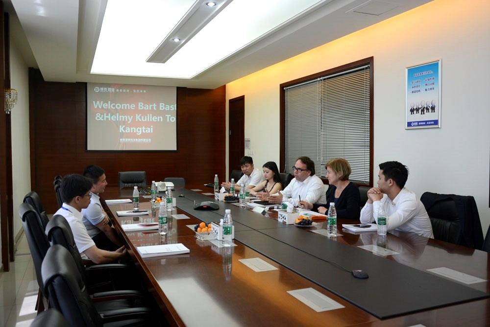 5月12日下午,荷蘭Greentom CEO Bart Bast、馬特里赫特市政府代表Helmy Kullen、荷蘭貿(mào)促會(huì)助理劉斯佳貴賓一行蒞臨康泰參觀考察??堤┘瘓F(tuán)副總裁張文霖,銷(xiāo)售副總監(jiān)林輝輝熱情歡迎外賓的到訪并座談。