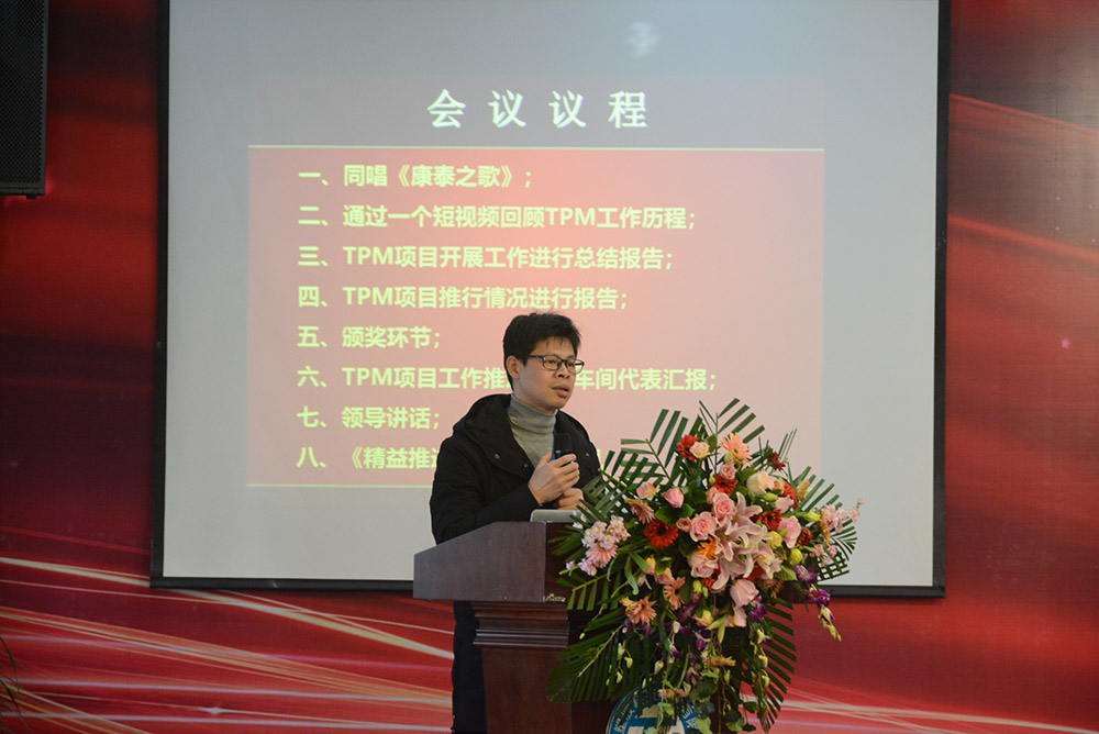 會議首先通過視頻回顧了TPM項目的導(dǎo)入、實施、改善,并對成果進行了展示。隨后,TPM項目組組長、生產(chǎn)副總監(jiān)李志堅作了《TPM項目開展工作進行總結(jié)匯報》。為了提升康泰集團在塑膠行業(yè)的競爭力,滿足客戶日益多樣化的需求,2017年9月28日,康泰集團導(dǎo)入了TPM——全面生產(chǎn)管理體系,圍繞TPM的自主維護、專業(yè)維護、現(xiàn)場改善及可視化等開展活動。通過活動的開展,生產(chǎn)系統(tǒng)各級對于TPM有了深刻的認識,車間員工學到了知識,提升了技能,對設(shè)備的傳統(tǒng)觀念有了轉(zhuǎn)變。截止2019年1月,現(xiàn)場發(fā)現(xiàn)問題7035項,整改6590項,整改率98% 。建立集團設(shè)備預(yù)防性維修保養(yǎng)體系,形成階段性標準化文件8份,設(shè)備故障率下降30% 。